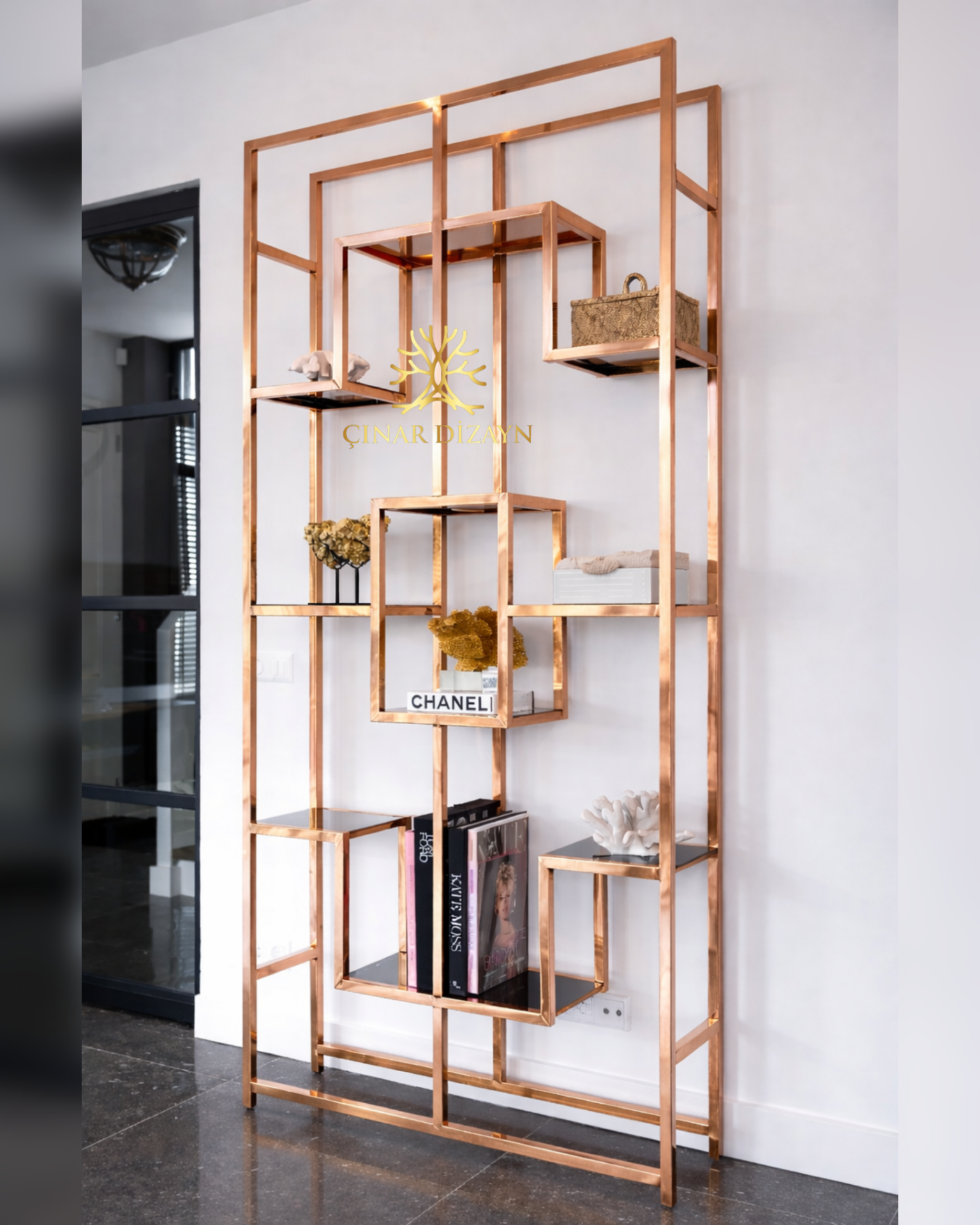 Şık ve modern tasarımıyla öne çıkan bu kitaplık, krom kaplama metal gövdesi ve cam rafları sayesinde mekâna ferah ve lüks bir görünüm kazandırır. Asimetrik raf düzeni dekoratif objeler, kitaplar ve aksesuarlar için hem estetik hem fonksiyonel bir kullanım sunar. Salon, ofis ve yaşam alanlarında Art Deco & modern tarzı tamamlayan güçlü bir parçadır.