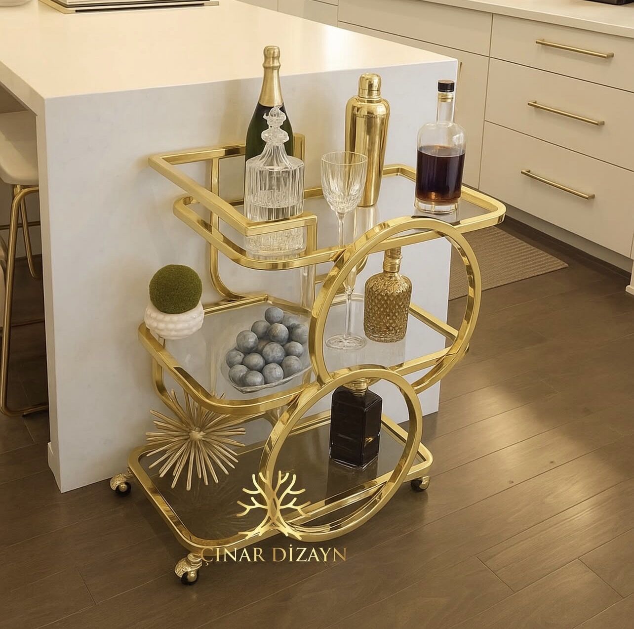 Paris Servis Arabası Gold/- Şeffaf Cam